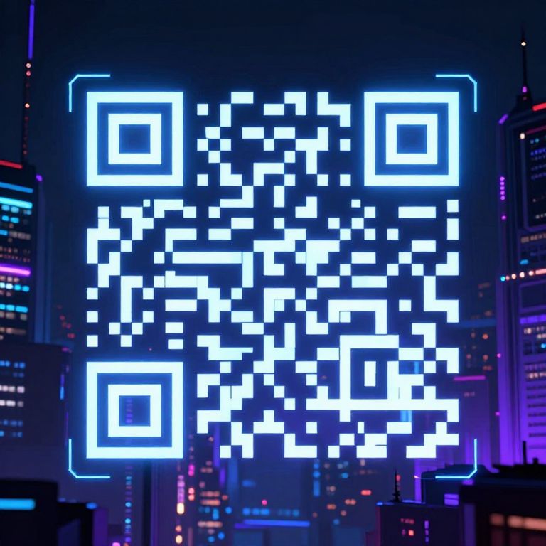 Qr code clip art, futuristic neon glowing QR code embedded in a cyberpunk city background, dark tones with electric blue and purple highlights, sci-fi atmosphere, detailed digital art with a tech-centric vibe