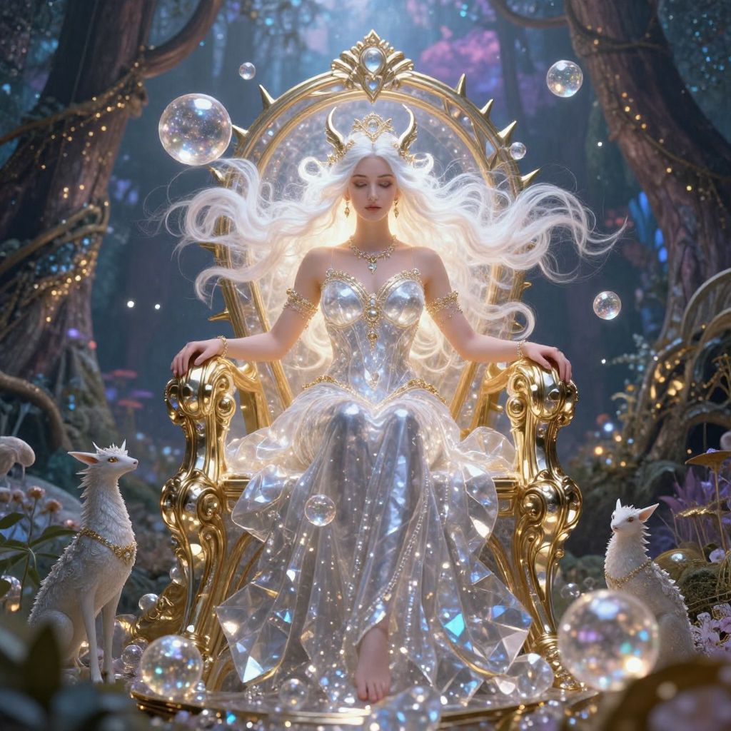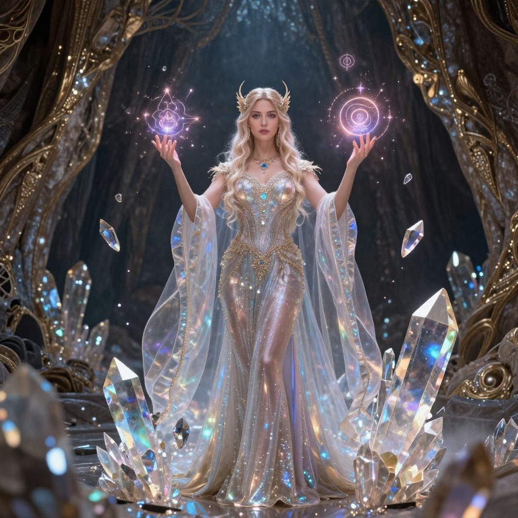 Hnoss goddess standing in a mystical Norse forest, ethereal light filtering through ancient trees, wearing flowing radiant robes adorned with symbols of treasure and beauty, surrounded by delicate golden artifacts and blooming flowers, magical ambiance