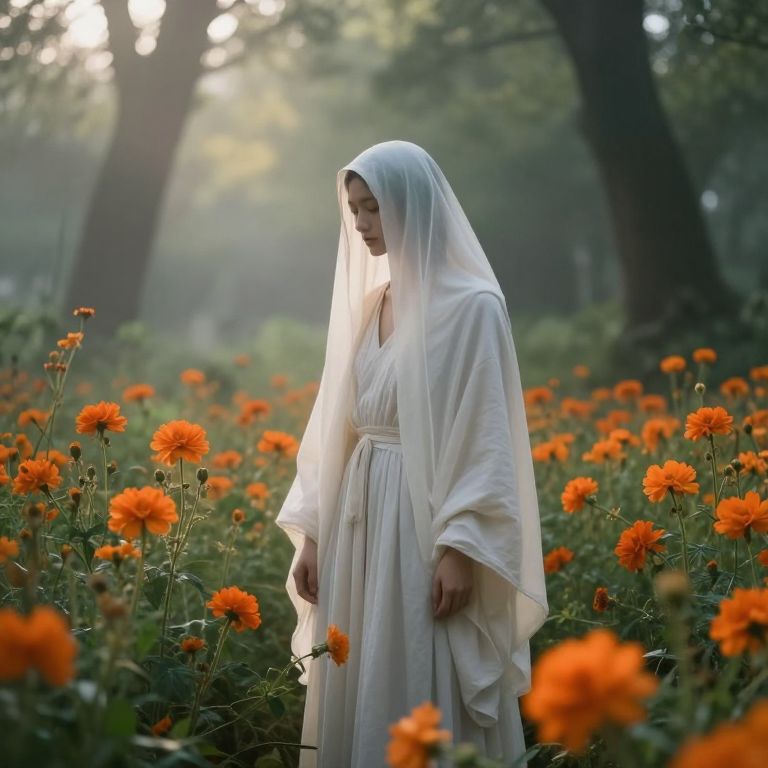 In a hazy forest bathed in ethereal light, a veiled figure stands amidst vibrant orange blooms, embodying the quiet serenity of a soul tending to gardens born of memory and longing, where whispers of the past weave into the present, singing a harmonious melody of hope and remembrance.