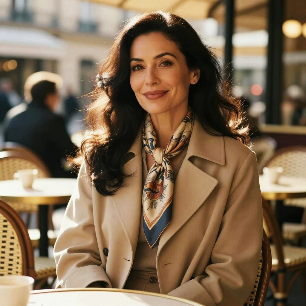 (masterpiece:1.1), best quality, (photorealistic:1.2), hyperrealistic, award-winning portrait of middle-aged woman, long wavy black hair, soft smile, upper body, expressive eyes, slim wai BREAK 1.1, wide hips:1.1, athletic-curvy build, wind-swept hair, sitting in vintage Parisian café terrace, wearing silk scarf and tailored coat, golden hour glow, dappled light, soft particles in the air, 8k, highly detailed, broad lighting, chromatic aberration, subtle film grain, ray tracing, octane render, soft bloom