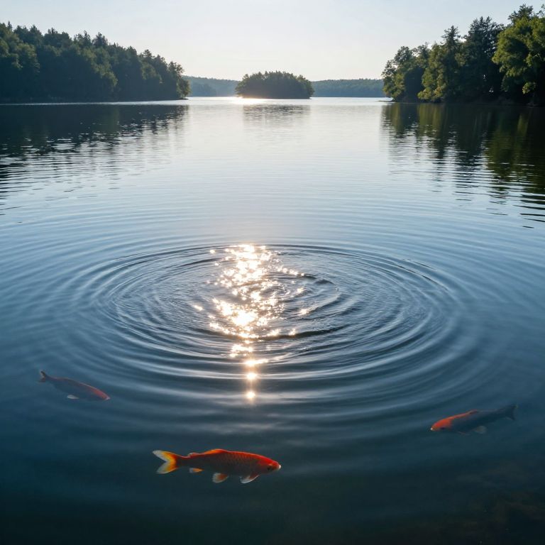 Sunlight cascades over a serene lake, casting radiant reflections as concentric ripples spiral outward, while vibrant fish swim gracefully beneath the surface, their movements mirrored by the tranquil forested islands that frame the horizon.