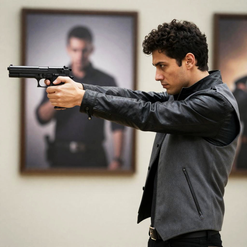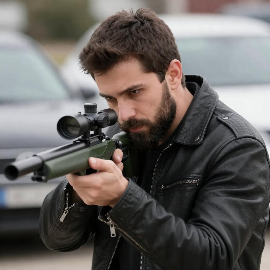 Photograph of a bearded man with dark brown hair, wearing a black leather jacket, aiming a green sniper rifle with a scope. He has a focused expression and is positioned in an urban setting with blurred cars in the background.