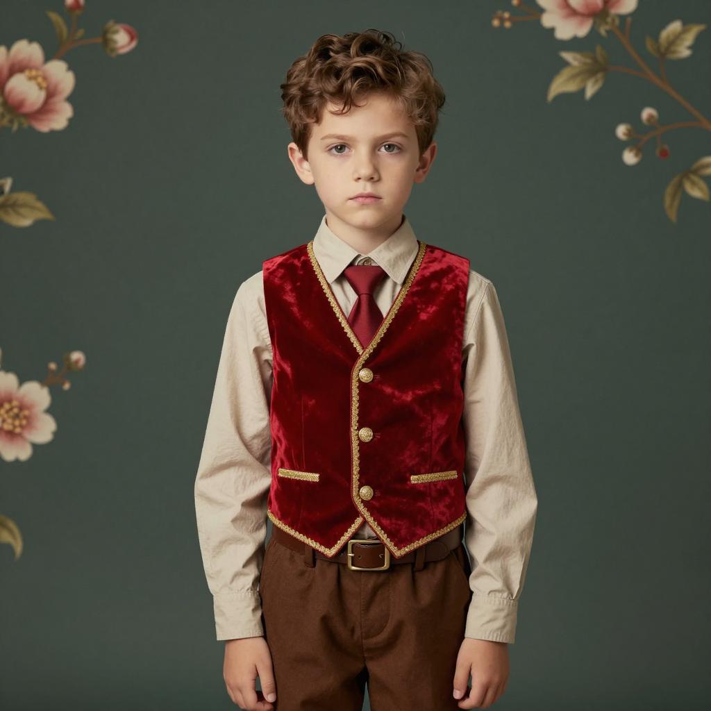 Portrait of a young boy with short brown hair and a serious expression, wearing a vintage-style outfit consisting of a red velvet vest with gold trim, a beige long-sleeve shirt, a red tie, brown pants with a matching belt, standing against a dark green floral-patterned background with soft lighting.