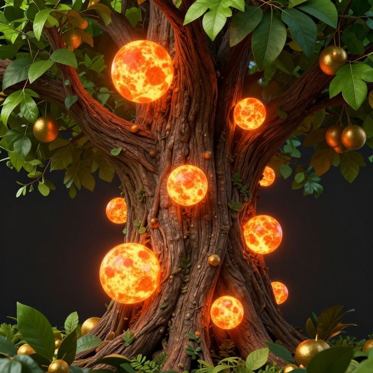 A fantastical 3D-rendered tree trunk adorned with glowing orange orbs resembling miniature solar systems, surrounded by vibrant green leaves and golden fruit, evokes a surreal, otherworldly atmosphere with dramatic lighting and high-definition detail.
