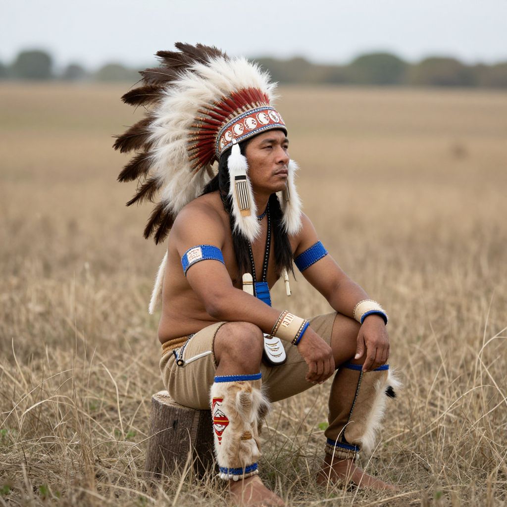 Photograph of a muscular, dark-skinned Native American man squatting in a dry, grassy field. He wears a traditional feathered headdress with white, black, and red feathers, a blue armband, and bead necklaces. His bare chest and beige loincloth contrast with his white, fur-trimmed moccasins. His expression is serious, eyes looking to the side. The background is a blurred, expansive, open field with a distant treeline. The image has a natural, earthy color palette, emphasizing his cultural attire and the dry, open landscape.