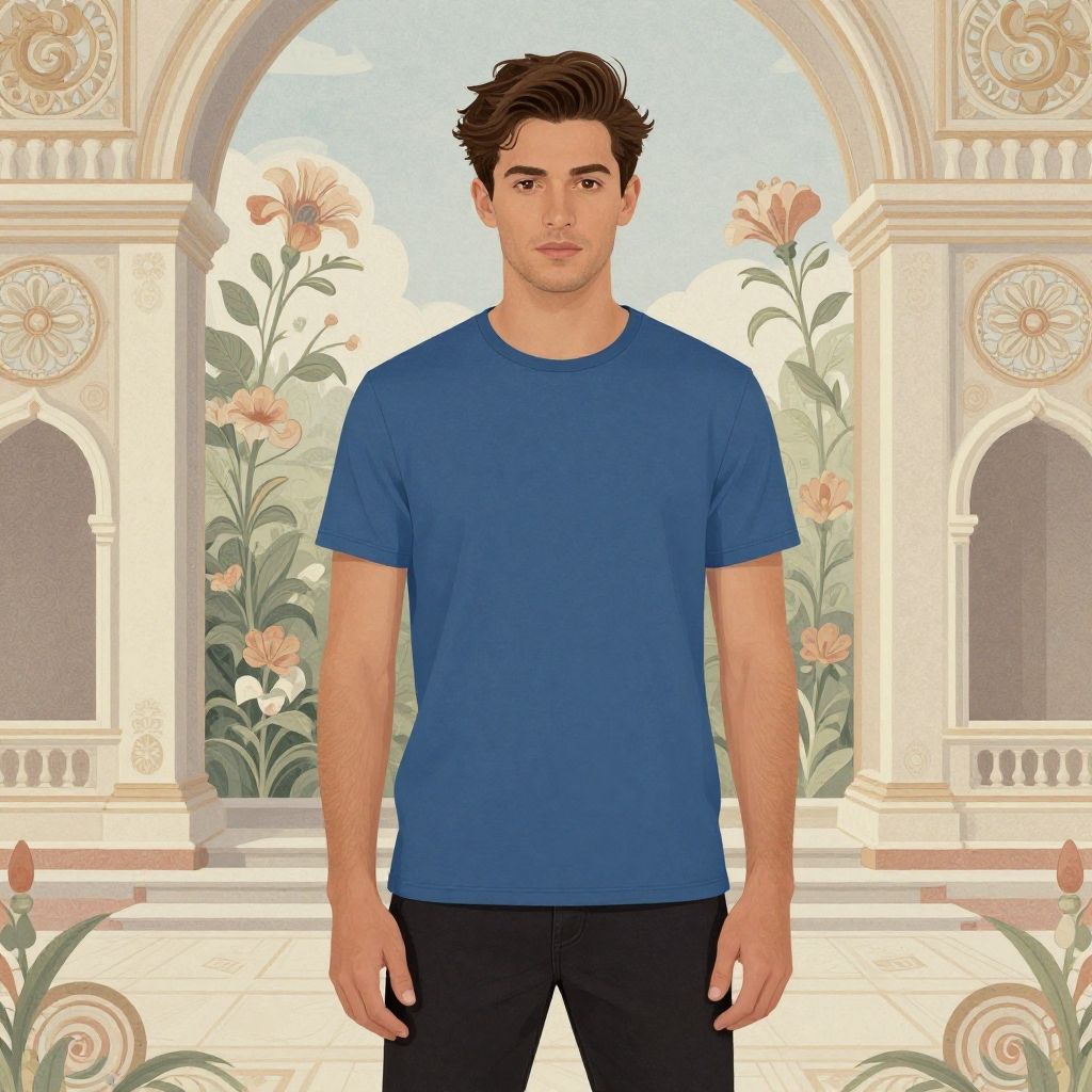 A stylish young man stands confidently in front of a backdrop of intricate floral designs and historic architecture. His blue T-shirt contrasts with the soft, muted tones of the detailed surroundings, creating a harmonious balance between modern fashion and classic aesthetics. The artwork's illustrative style emphasizes the textures and patterns, bringing the scene to life.