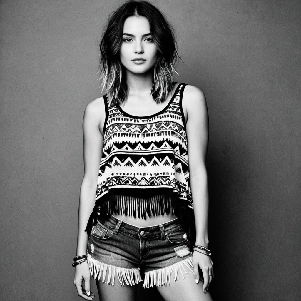 Woman, bohemian style, black and white tribal print tank top with fringe detailing at the hem, distressed denim shorts with frayed edges, studio background with a gray gradient.