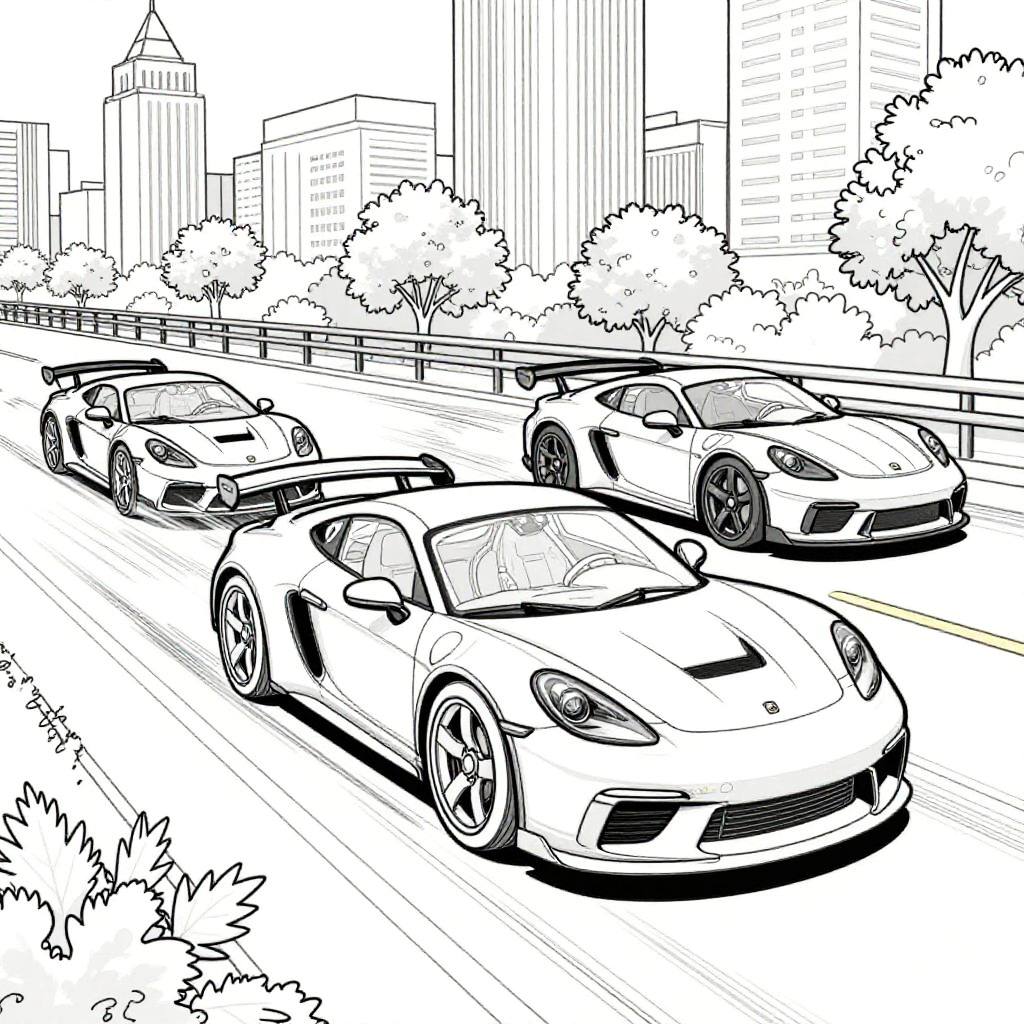 Chase coloring scene displaying a high-speed car pursuit, sleek vehicles weaving through urban streets, dynamic angles with clear lines for coloring, emphasizing speed and excitement, ideal for adventure-themed coloring books.