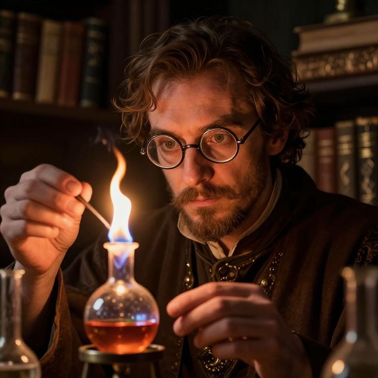 Photograph of a middle-aged man with curly brown hair, a beard, and round glasses, intently focusing on a small flame in a glass beaker filled with a reddish liquid. He wears a dark, textured robe with a subtle sheen. The background is dimly lit, showcasing an old bookshelf filled with leather-bound books. The warm glow of the flame illuminates his face, highlighting his focused expression. The image has a rich, dramatic atmosphere with deep shadows and warm hues, reminiscent of a historical or alchemical setting.