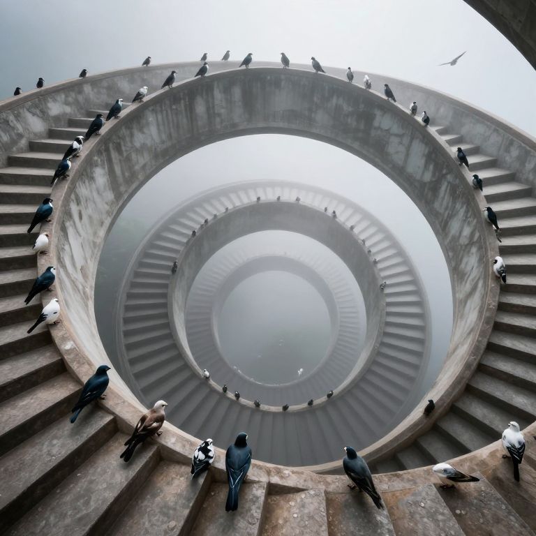Graceful birds perch serenely on a labyrinthine staircase that defies gravity, spiraling endlessly into a misty void where reality bends and loops upon itself.