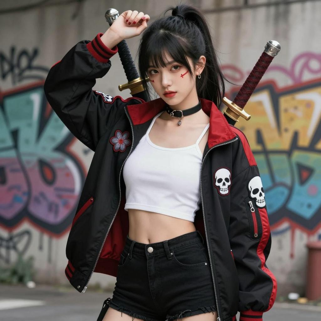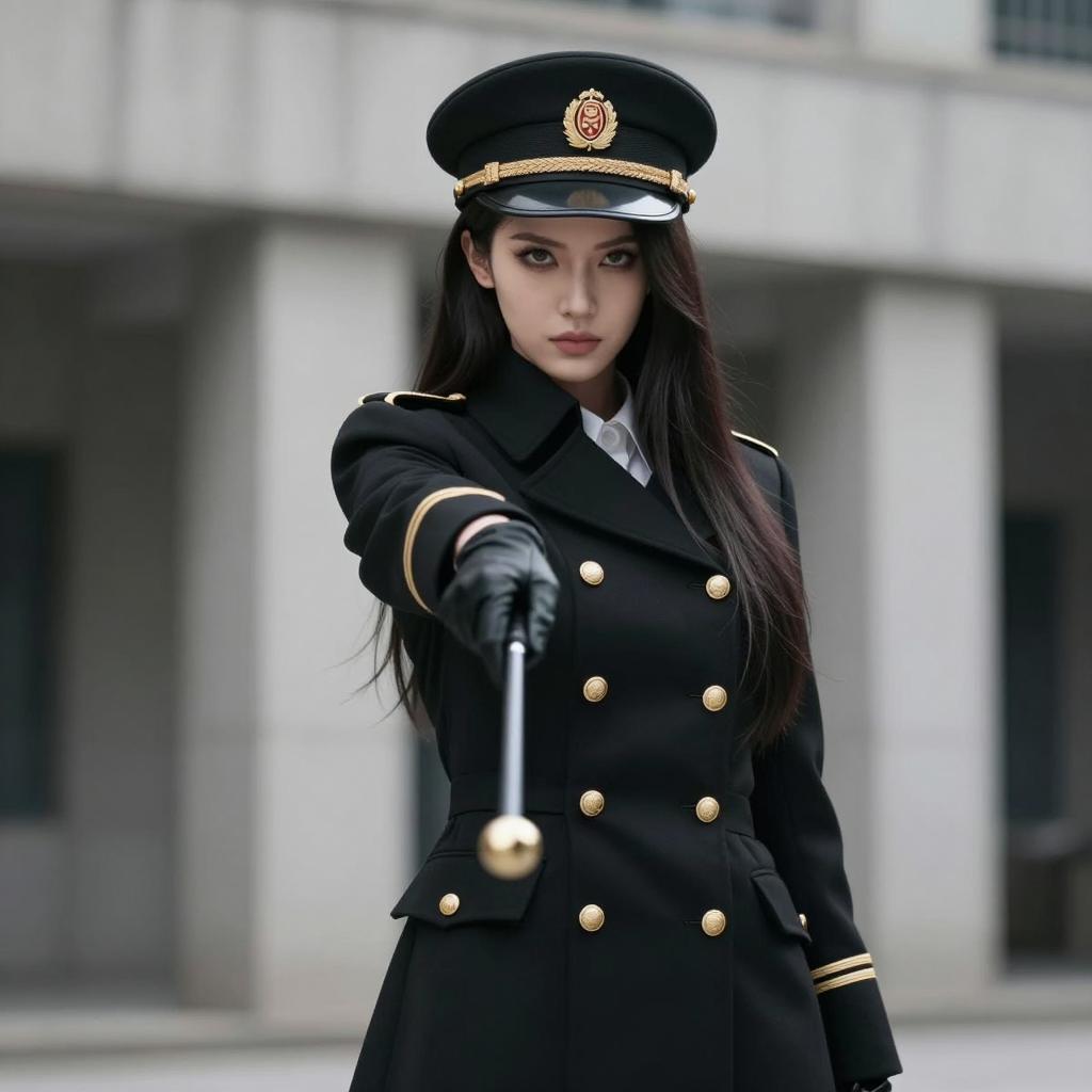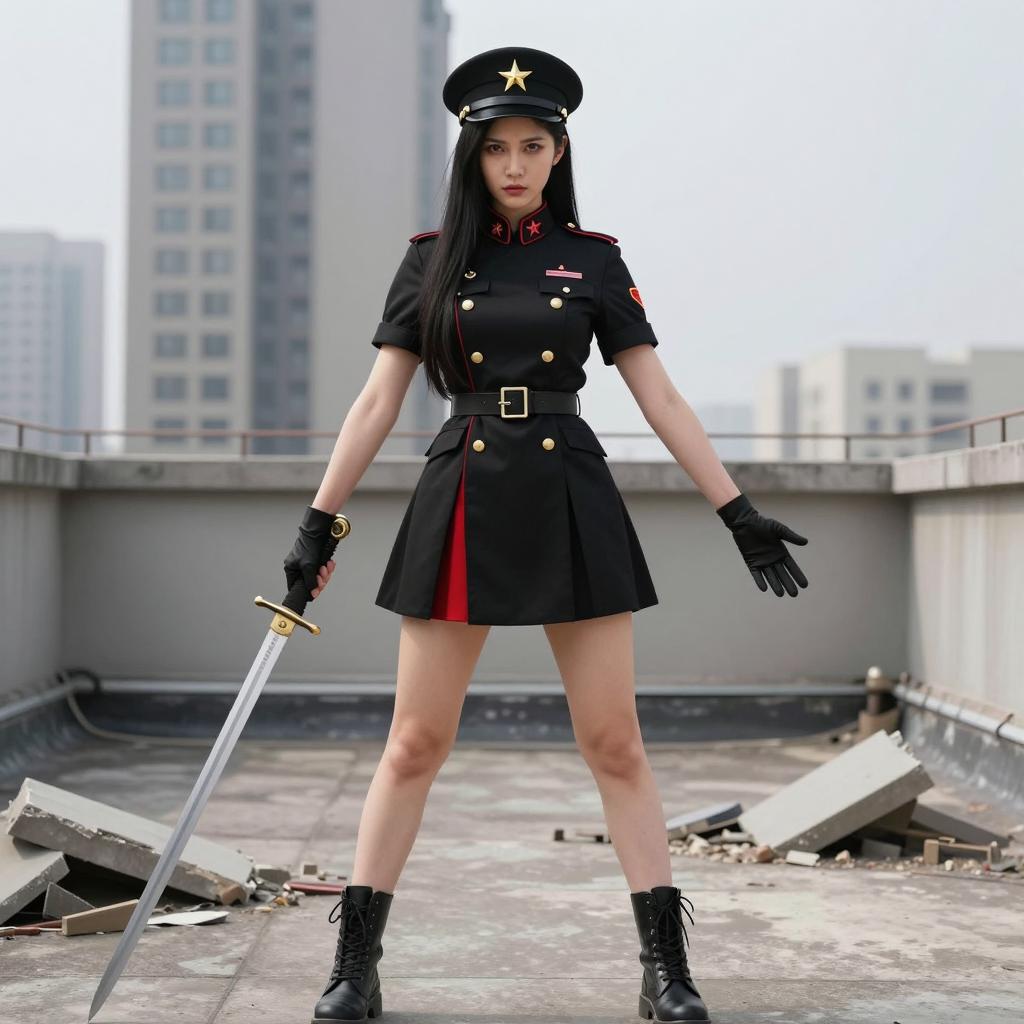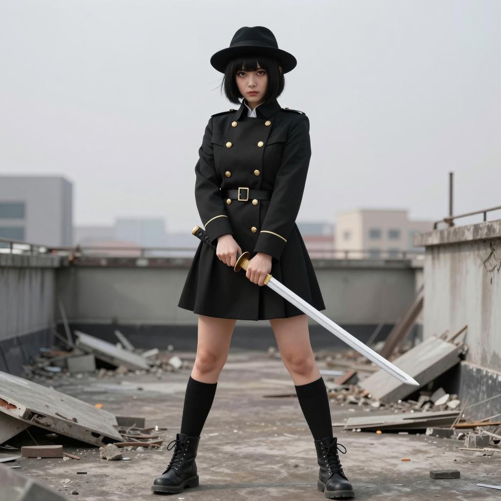 Asian woman with short black hair in a black military-style uniform and hat, holding a sword in her left hand and a lighter in her right hand. She has a serious expression. She stands on a rubble-strewn rooftop with industrial buildings in the background. Her uniform has gold accents and a pleated skirt. Overcast sky.