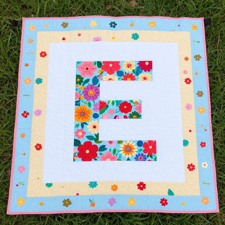 Colorful handmade quilt featuring a playful design with a large letter \"E\" in vibrant floral patterns, surrounded by a cheerful border of pastel tones and scattered flower motifs, displayed outdoors on green grass.