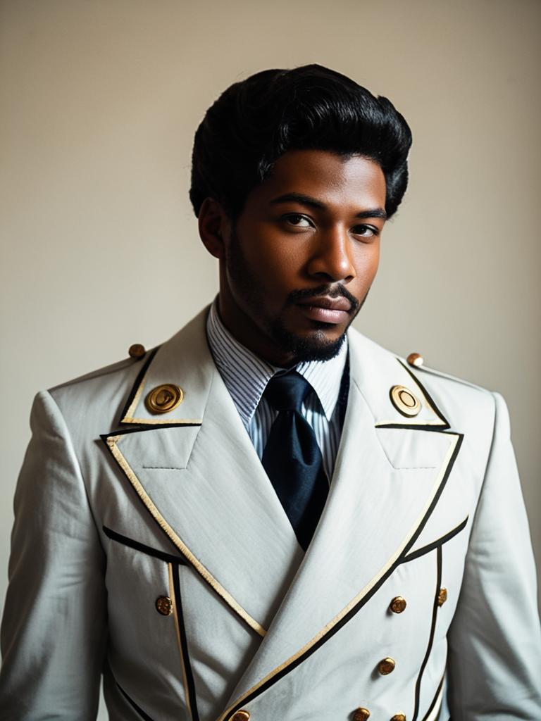 Costume fancy dress, solo, 1boy, standing, male focus, full body, long sleeves, facial hair, brown footwear, dark skin, crown