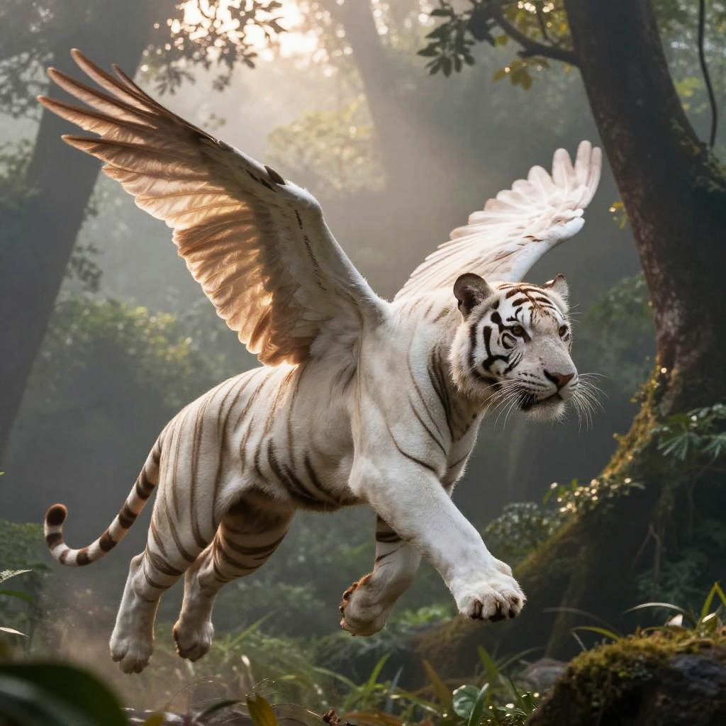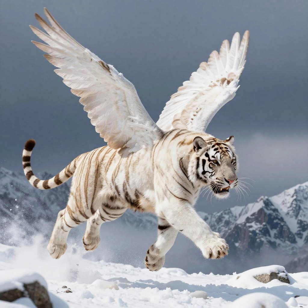 Fierce white tiger with large angelic wings in mid-flight above a snowy mountain range, dynamic pose, dramatic lighting highlighting muscles and feathers, fantasy epic scene