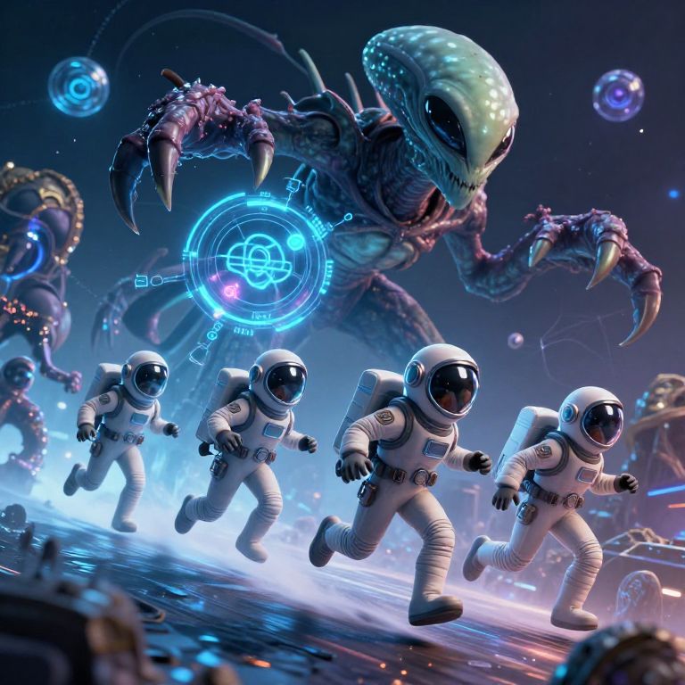 Digital illustration of four astronauts in space suits running on a futuristic alien planet. Behind them, a large hostile alien creature with claws and an intimidating posture is chasing them. The scene includes holographic digital elements and a high-tech sci-fi background with a mystical atmosphere.
