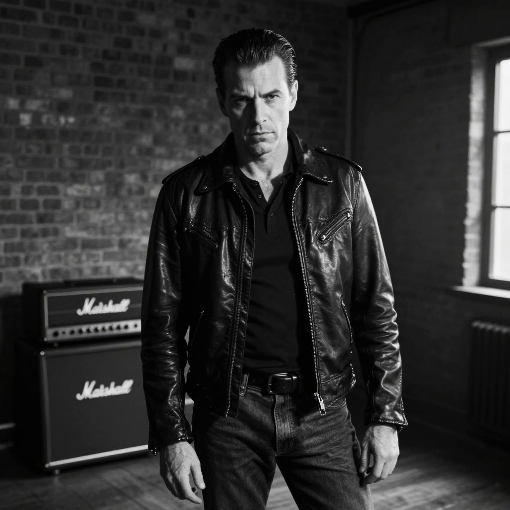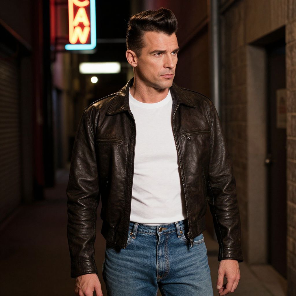 Classic quiff, fit european man, 1950s rockabilly vibe, slicked-back hair with a side part, fitted leather jacket, white t-shirt, jeans, cropped jacket, standing in a dimly lit alley with neon signs, moody atmosphere, high contrast lighting, cinematic depth