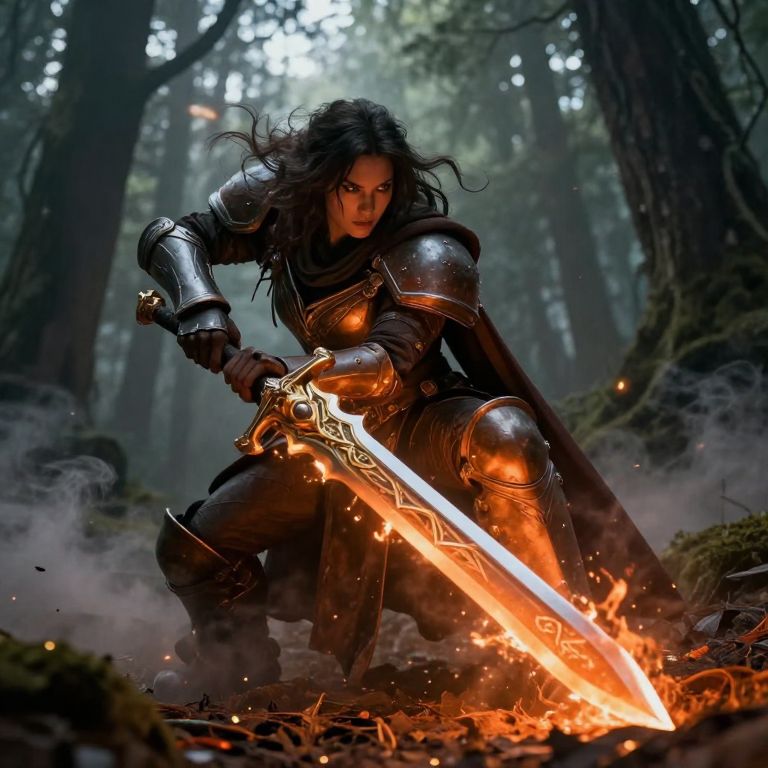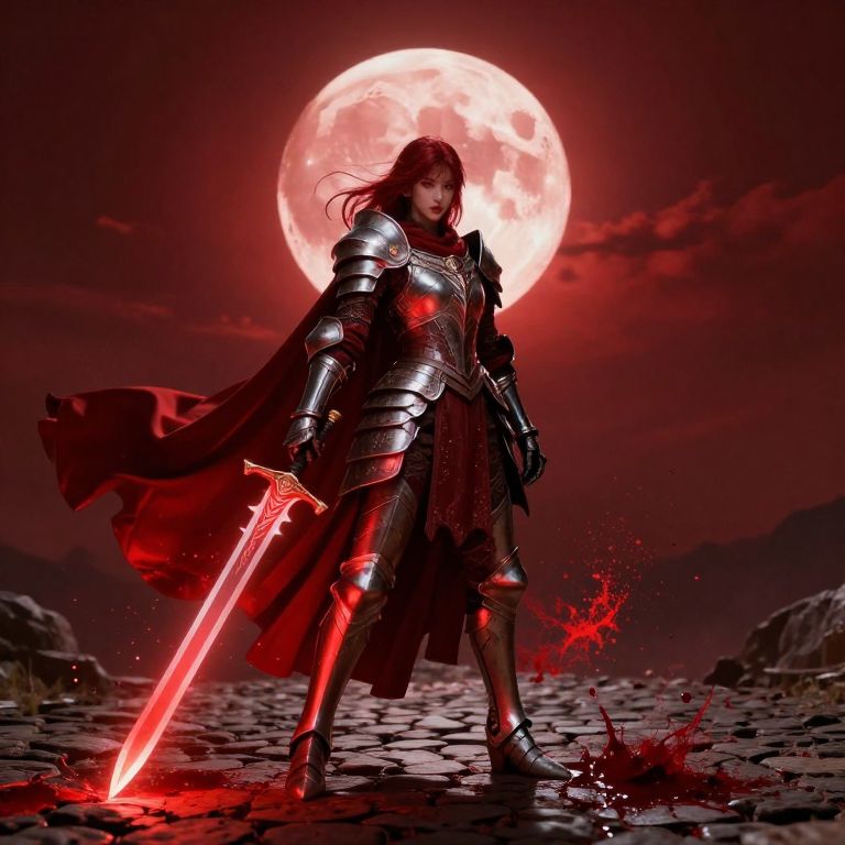 A spectral warrior clad in ornate armor and flowing cape stands defiantly against a crimson moonlit sky, her ethereal form illuminated by swirling red particles as she wields a glowing sword amidst a bloodstained cobblestone path.