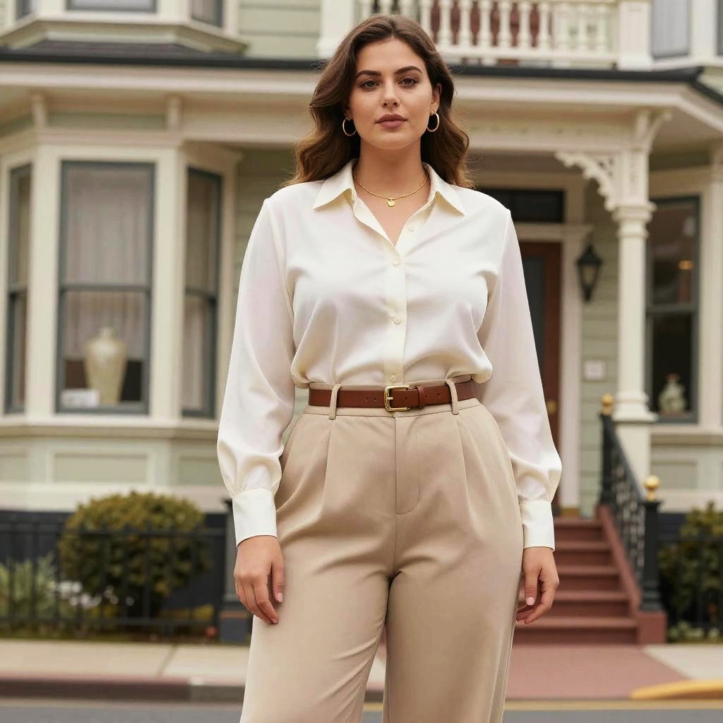 A curvy woman in modern minimalism, wearing an ivory silk blouse with a pointed collar and high-waisted beige wide-leg trousers, accessorized with a brown leather belt and minimal jewelry, stands gracefully in a vintage boutique in a Victorian house. Sexy. Pretty face and beutiful eyes