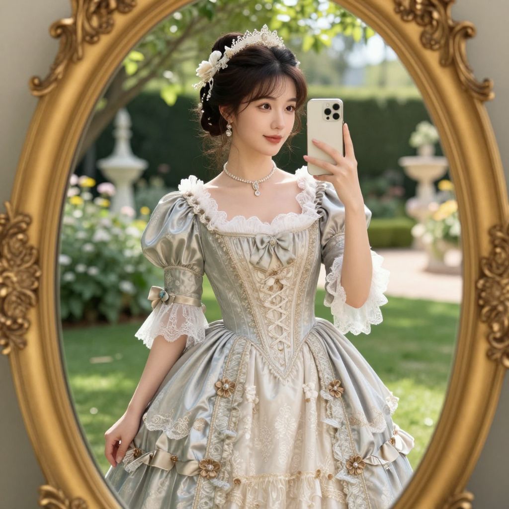 A digital illustration depicts a woman in an ornate, vintage-style gown taking a selfie in a gold-framed mirror, with a lush, sunlit garden reflected behind her, showcasing a blend of classical elegance and modern technology.