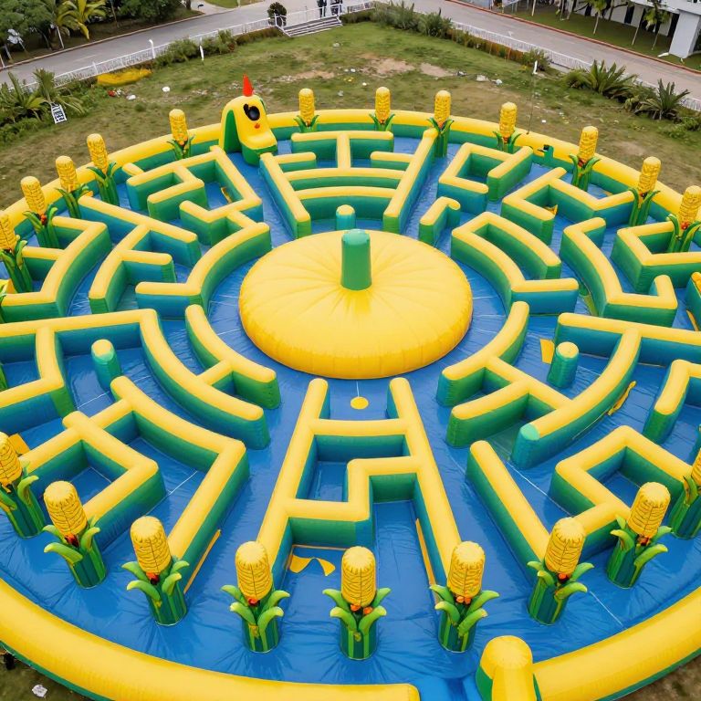 A large, intricate inflatable corn maze with a winding path and a central yellow circle.