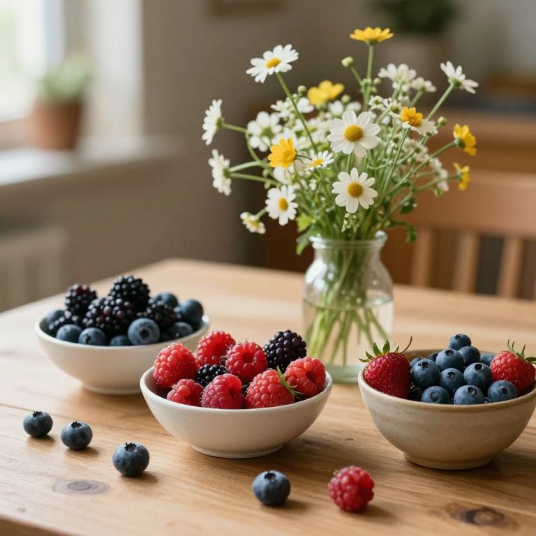 An intimate tableau of serenity and abundance, where vibrant berries and delicate wildflowers evoke a sense of natural harmony and timeless beauty, inviting quiet reflection amidst the warmth of home.