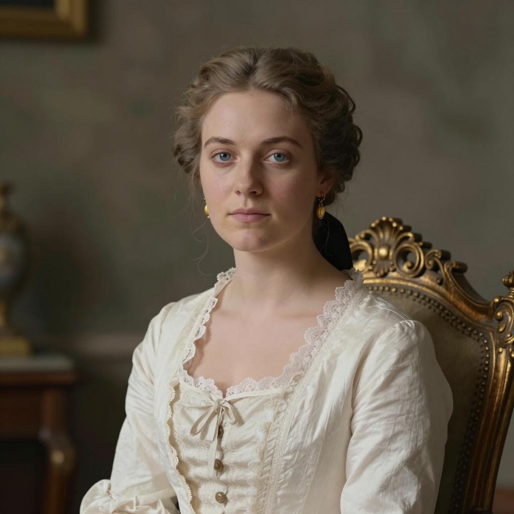 Two people in 18th-century clothing. Woman with blonde hair, lace headband, floral dress, reading book, sitting. Man with dark hair, white lace-trimmed coat, sitting beside her. Background: bench, dark hedge. Woman's expression focused, man's expression neutral.