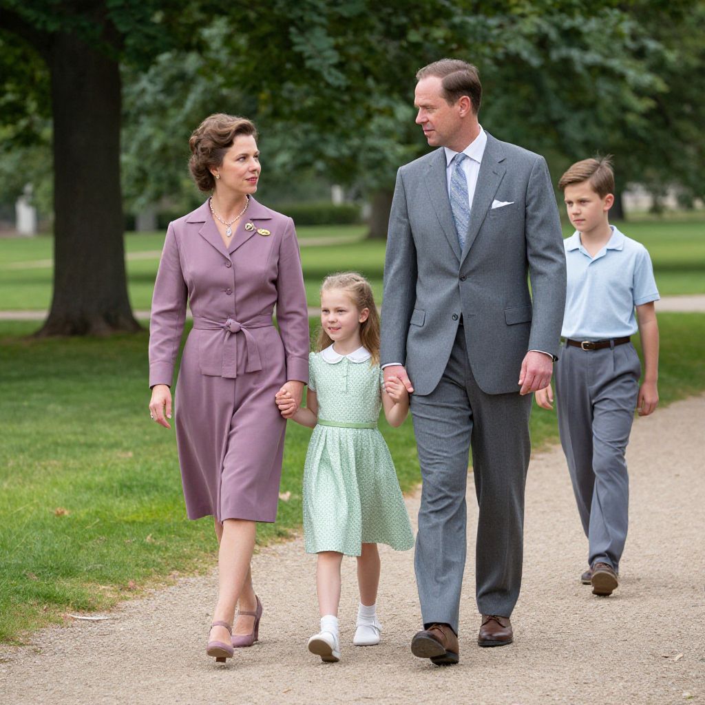 Strolling through a serene park path, a formally dressed family of three—a woman in a mauve suit, a man in a gray suit, and a young girl in a green dress—walk hand-in-hand, accompanied by a casually dressed individual trailing behind, evoking the elegance and simplicity of the 1950s royal family.