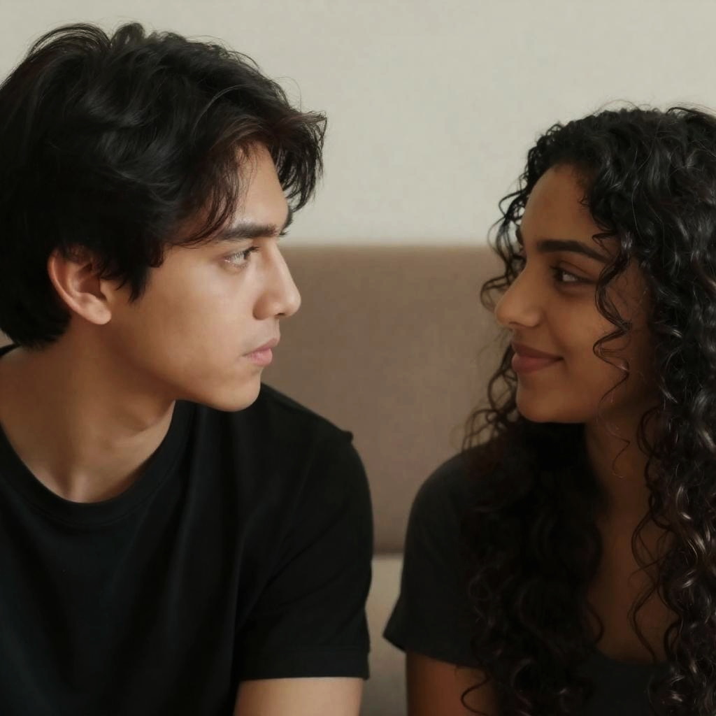 Photograph of two people in close-up, facing each other. Man on left with dark hair, black shirt, intense expression. Woman on right with long curly hair, dark shirt, smiling. Warm light, blurred portrait in background, couch visible.