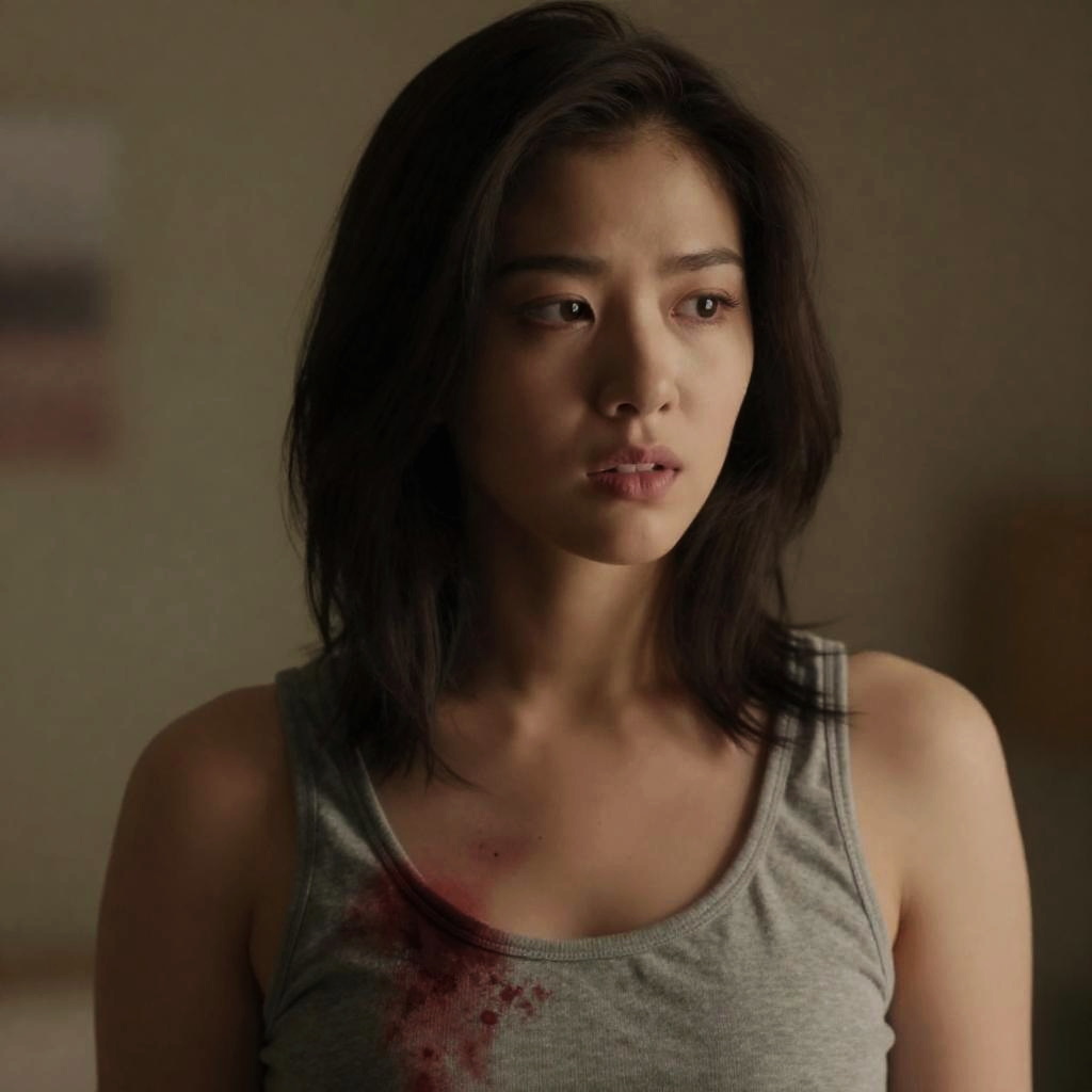 Photograph of a young woman with shoulder-length dark brown hair, wearing a blood-stained gray tank top, looking intently to the side with slightly parted lips. Background is blurred with warm, soft lighting.