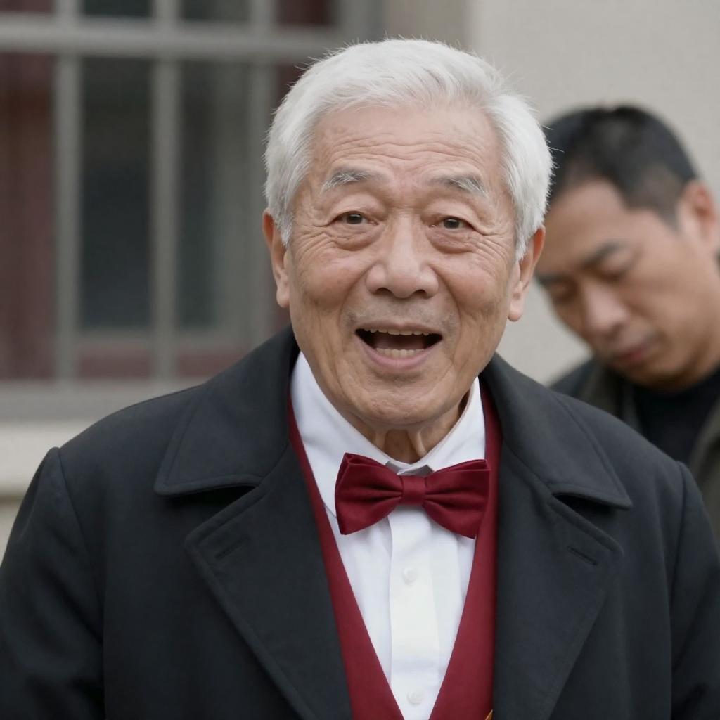 Photograph of an elderly man in a black suit, white shirt, and black bow tie, wearing a black hat and gloves, with arms outstretched, yelling. He stands on a street with a young woman with long brown hair, head down, in the foreground. Background includes buildings, trees, and a mountain. Bright daylight.