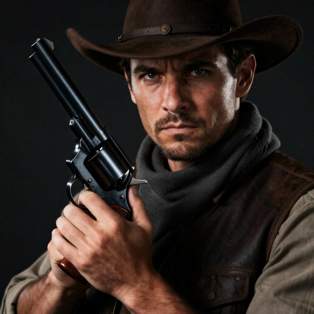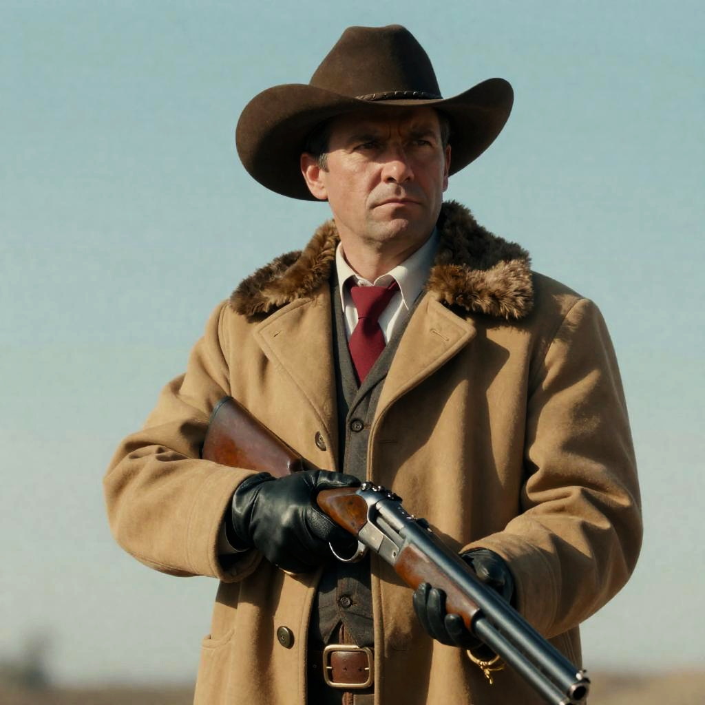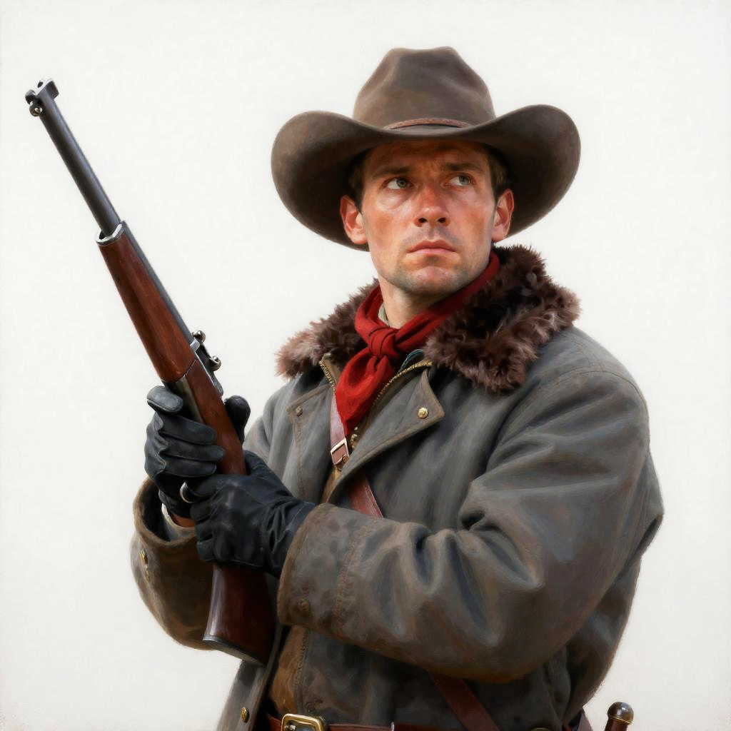 Painting of a white man in a cowboy hat, holding a rifle. He wears a gray coat with a fur collar, red scarf, and dark gloves. His face shows determination. He looks upward with a focused expression. Background is plain white.
