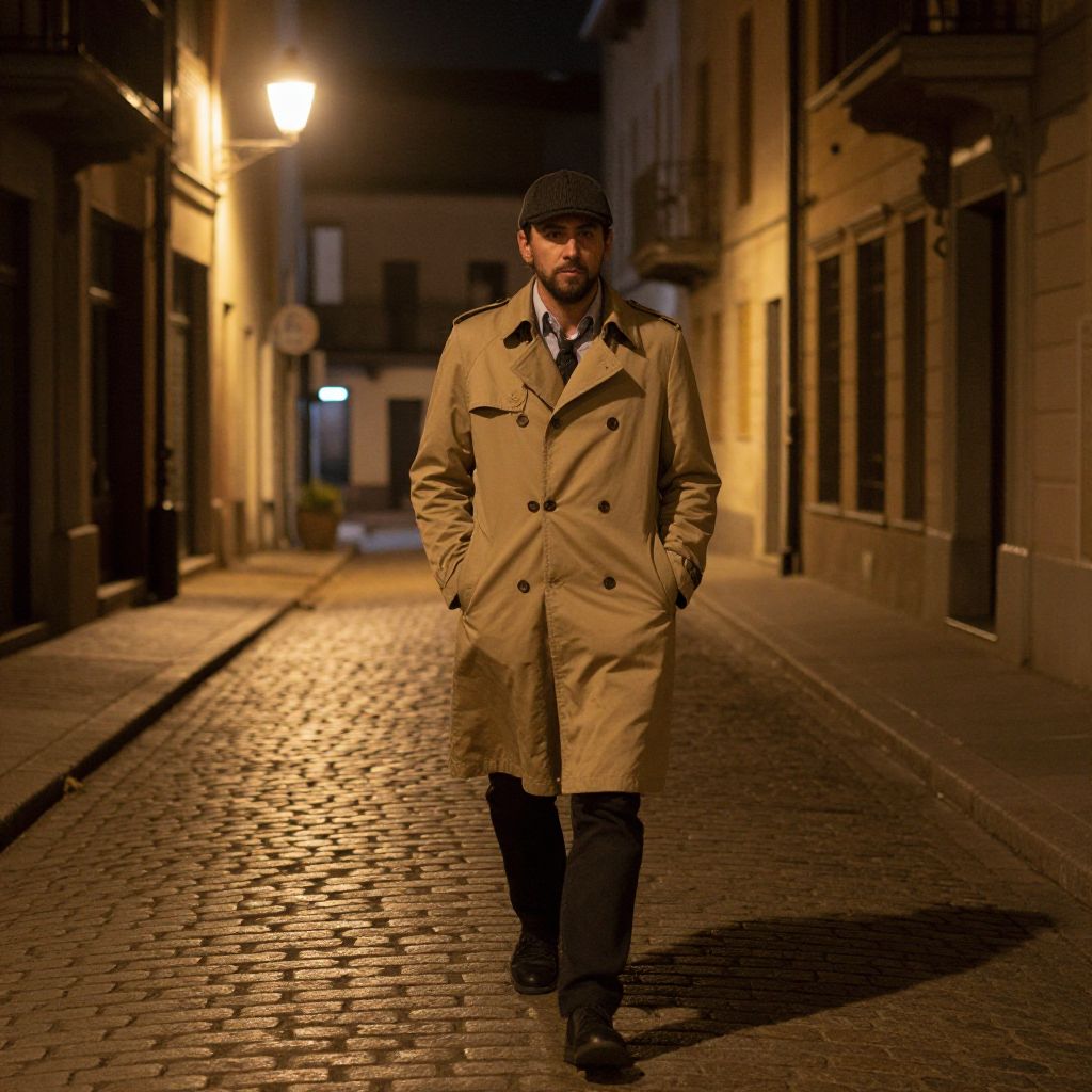 Photograph of a bearded man in a tan trench coat and black hat walking down a dimly lit, cobblestone street at night. Warm
