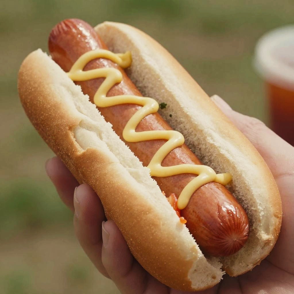Close-up of eating a hot dog sideways, juicy sausage and fresh bun with toppings, picnic setting, soft natural lighting, detailed and appetizing