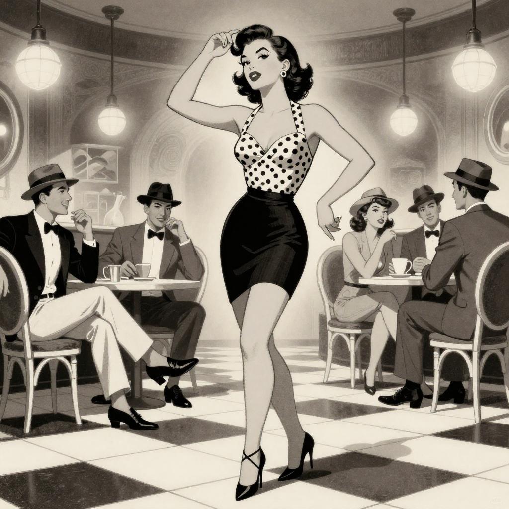 Black and white vintage-style illustration of a confident woman dancing in a stylish 1970s nightclub with a checkered floor and retro lighting. The woman wears a polka dot halter top and a fitted black skirt with high heels. In the background, men and women in fedoras, suits, and classic dresses sit at tables with coffee cups, embodying a lively social setting.