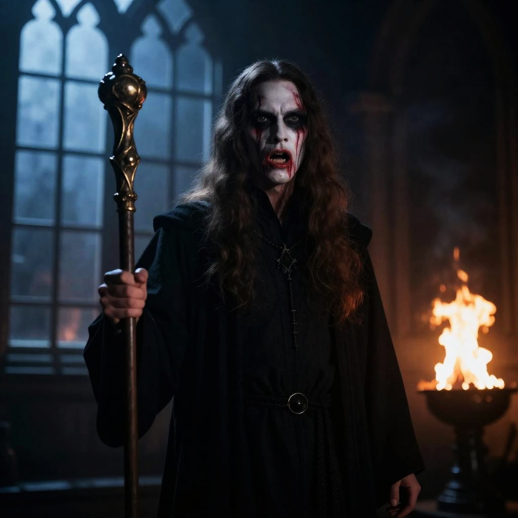 Gothic Sorcerer with Staff and Blood-Streaked Face