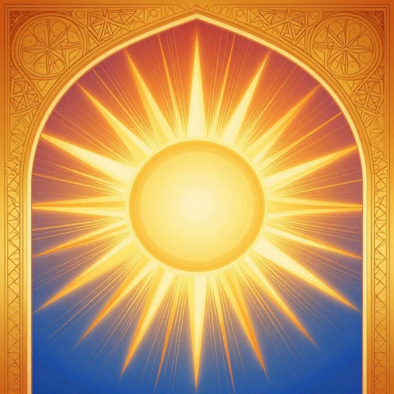 Digital illustration of a radiant sun with bright yellow and orange rays emanating from a central, glowing orb. The sun is set within an intricately patterned, golden archway that frames the top and sides. The background transitions from deep blue at the bottom to a warm gradient of red and orange around the sun. The archway features geometric and floral designs, enhancing the Islamic art-inspired aesthetic. The overall composition is vibrant and symmetrical, with the sun's intense light contrasting against the dark blue background.