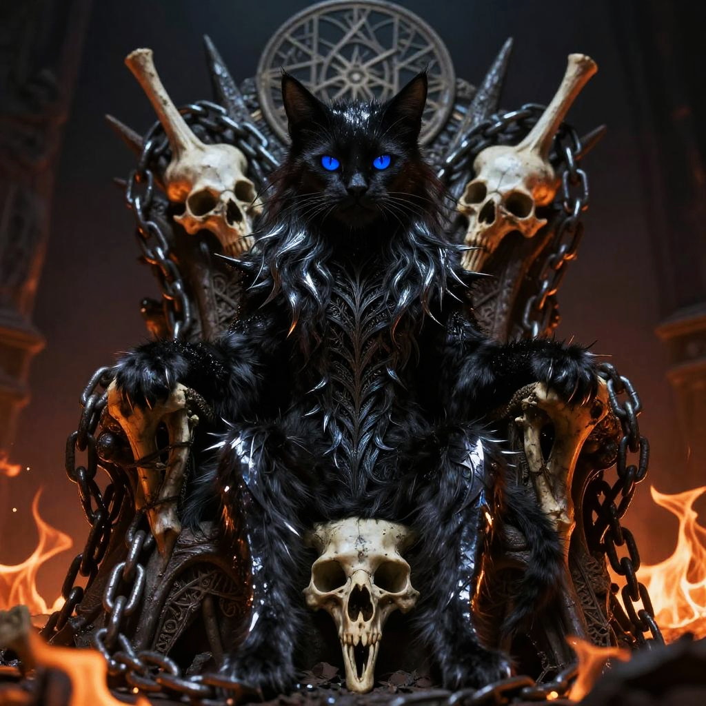 Black metal cat with long, flowing metallic fur that looks like sharp blades, piercing blue eyes, sitting atop a throne made of bones and chains, surrounded by dark flames and arcane symbols, dramatic and powerful ambiance.
