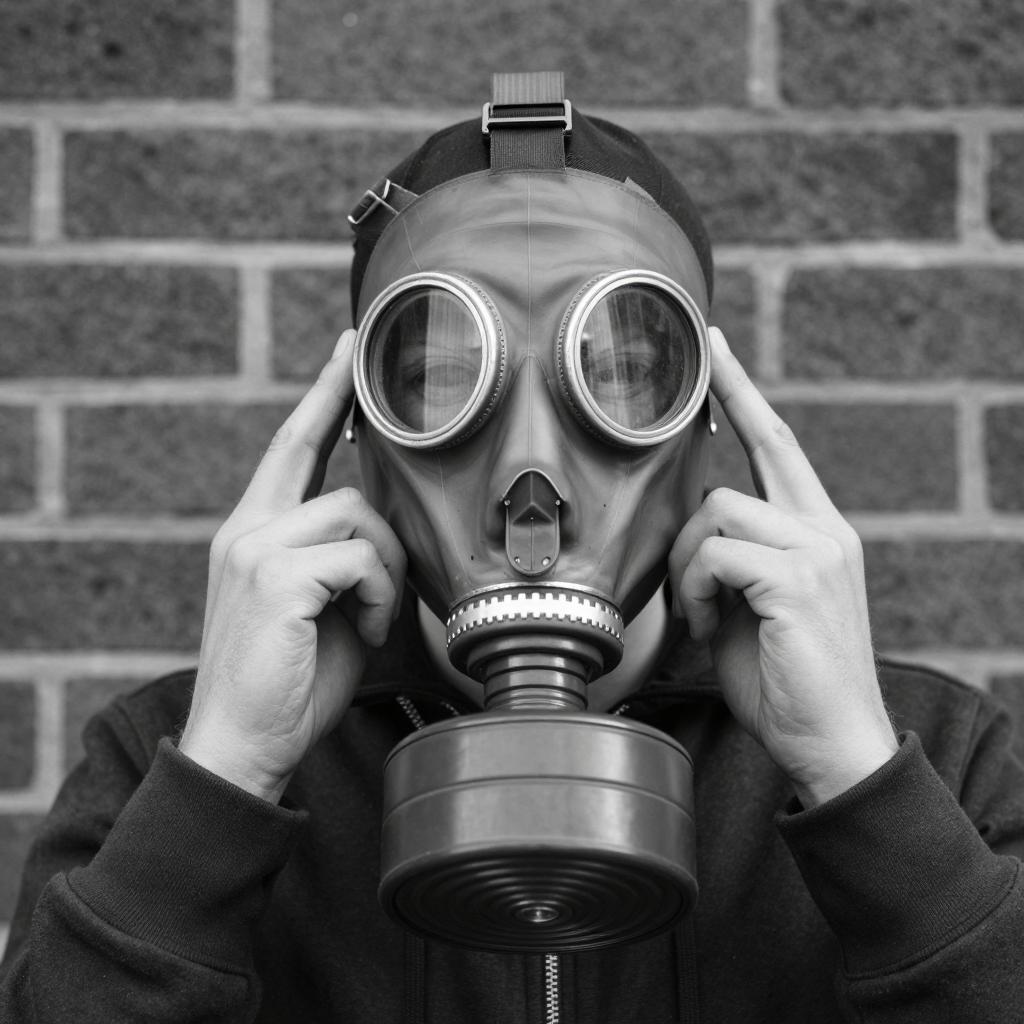 Black and white photograph. Person wearing a dark, vintage gas mask with round eye pieces and a filter, adjusting the mask with both hands. Person's hands are light-skinned, visible from the wrists down. Brick wall in the background. Person's face is not visible. Wearing a dark, long-sleeved shirt. Mask has a prominent, ured filter and a metal nose piece.