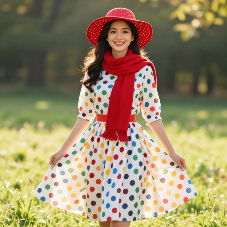 A vibrant female standing in a sunny meadow, wearing a cheerful polka dot outfit that includes a polka dot dress with a flowy skirt and a matching polka dot blouse. She wears a bright red hat with a wide brim and a small polka dot pattern, and a cozy red scarf wrapped neatly around her neck, adding a touch of warmth and charm. Her smile is bright and genuine, with soft sunlight streaming through the trees behind her, highlighting her joyful expression and the colorful details of her outfit.
