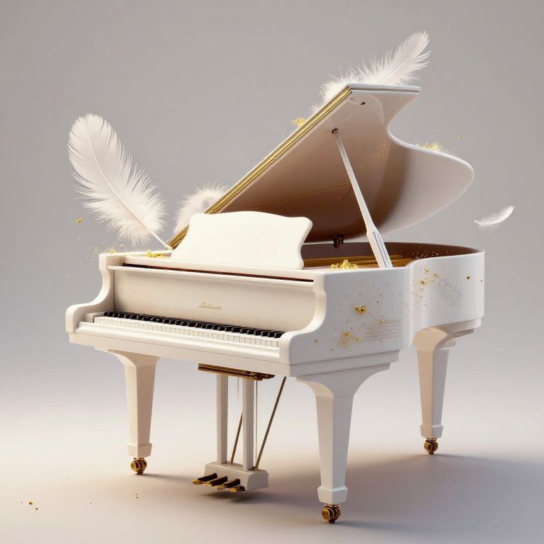 Photograph of a pristine white grand piano with its lid open, adorned with delicate white feathers floating around it. The piano's surface is ornately decorated with subtle gold patterns. The keys are black and white, and the legs are elegantly curved. The background is a gradient of light gray to white, creating a soft, ethereal atmosphere. The piano's lid reflects light, adding a luminous quality to the image. The feathers appear to be gently drifting, as if carried by a gentle breeze.
