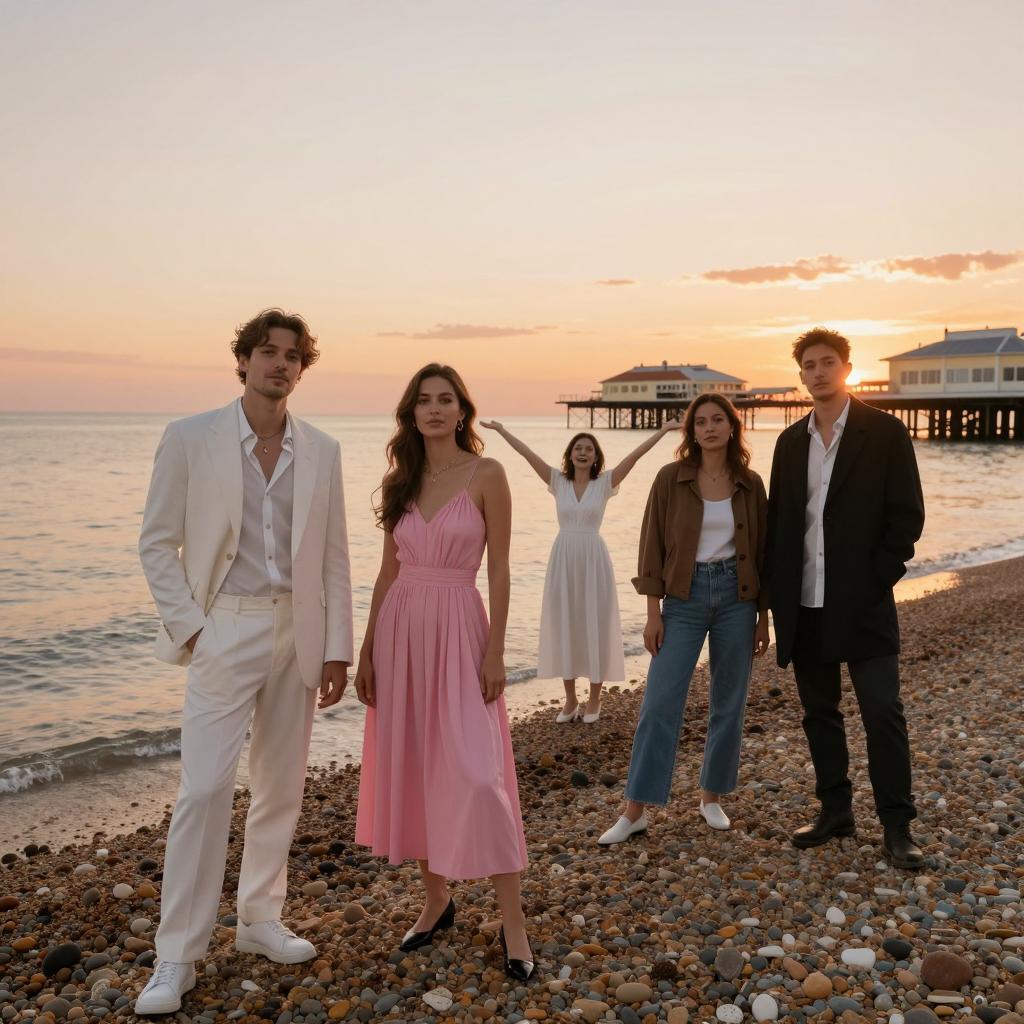 Five young adults standing on a pebble beach during sunset. The foreground features a man in a white suit and a woman in a pink dress with relaxed expressions. In the background, a woman in a white dress laughs with arms outstretched. To the right, a woman wearing a brown jacket and blue jeans stands next to a man in a black coat and black pants, both with neutral expressions. The scene includes two large pier buildings over the water and a warm orange sky reflecting on the sea.