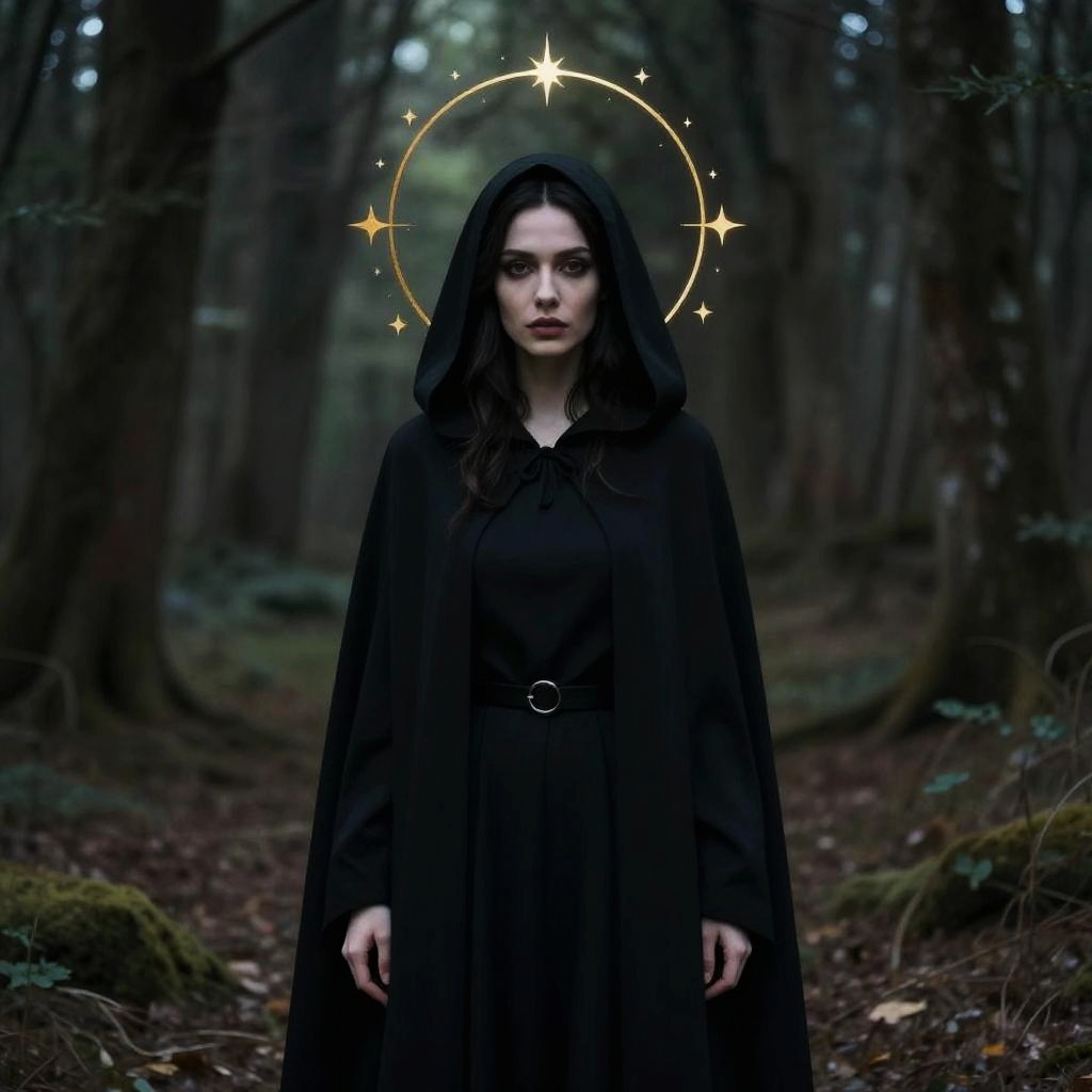 A striking portrait of a woman dressed in a sleek, black hooded cloak standing in a mysterious, dimly-lit forest. Behind her head, a golden halo-like circle adorned with small stars creates a celestial, almost sacred atmosphere. The image blends fantasy and dark gothic elements with a surreal, painterly style.