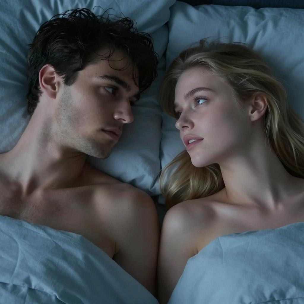 Intimate Bedroom Moment with Neutral Expressions
