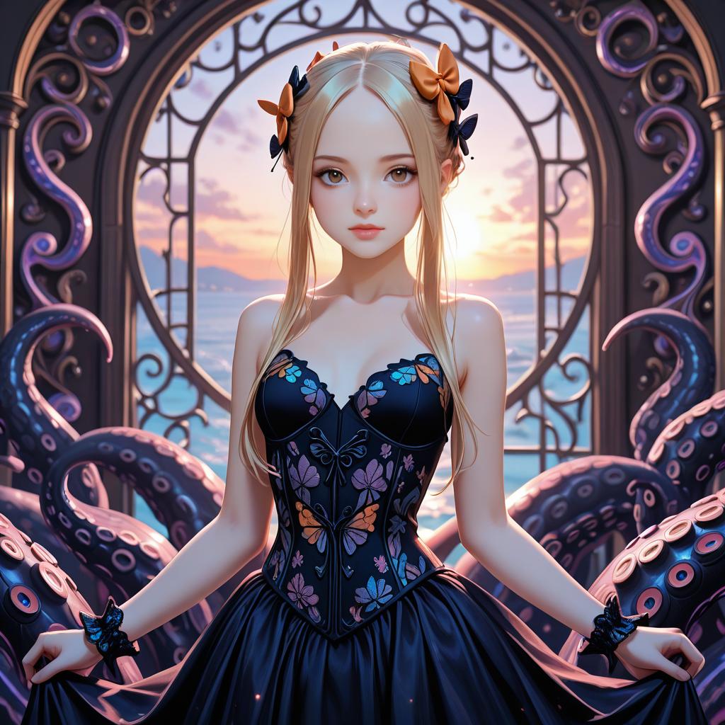 Anime Girl in Butterfly Corset Dress with Octopus Tentacles