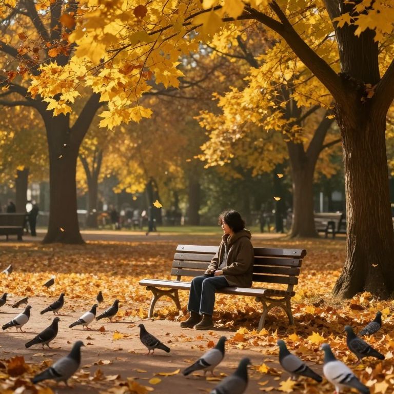 Autumnal hues paint the vibrant scene of St James's Park, London, where golden and fiery orange leaves cascade from towering trees, casting dappled shadows over a lush green lawn dotted with fallen foliage, while a distant city skyline and a few pedestrians add depth to the tranquil urban park setting.