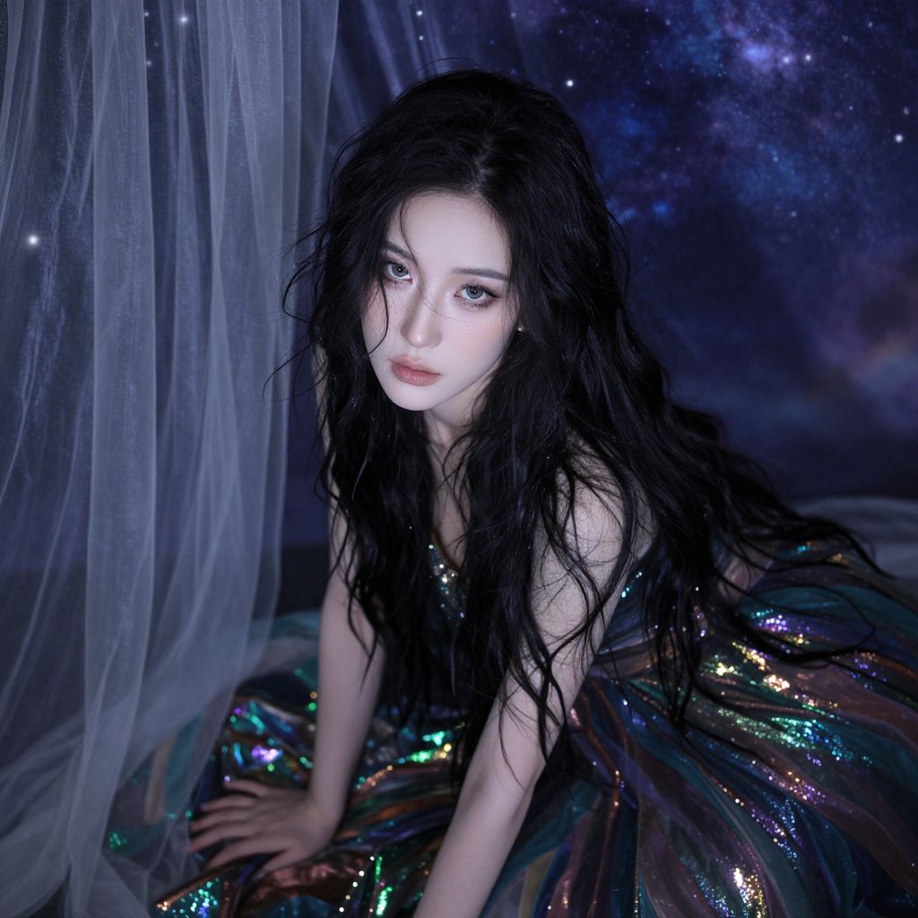 Create an ultra-high-resolution photorealistic portrait of a mysterious Central Asian woman with pale skin and cascading raven locks. She wears an ethereal, iridescent gown shimmering in captivating colors. Shot from an overhead angle, the image evokes enchantment and intrigue as her piercing gaze fixes on the distance, mirroring the vibrant hues of a starlit sky. Bathed in soft celestial light filtering through sheer curtains, this mesmerizing scene blends beauty, vulnerability, and mystery, drawing viewers into the enigmatic allure of this captivating portrait.