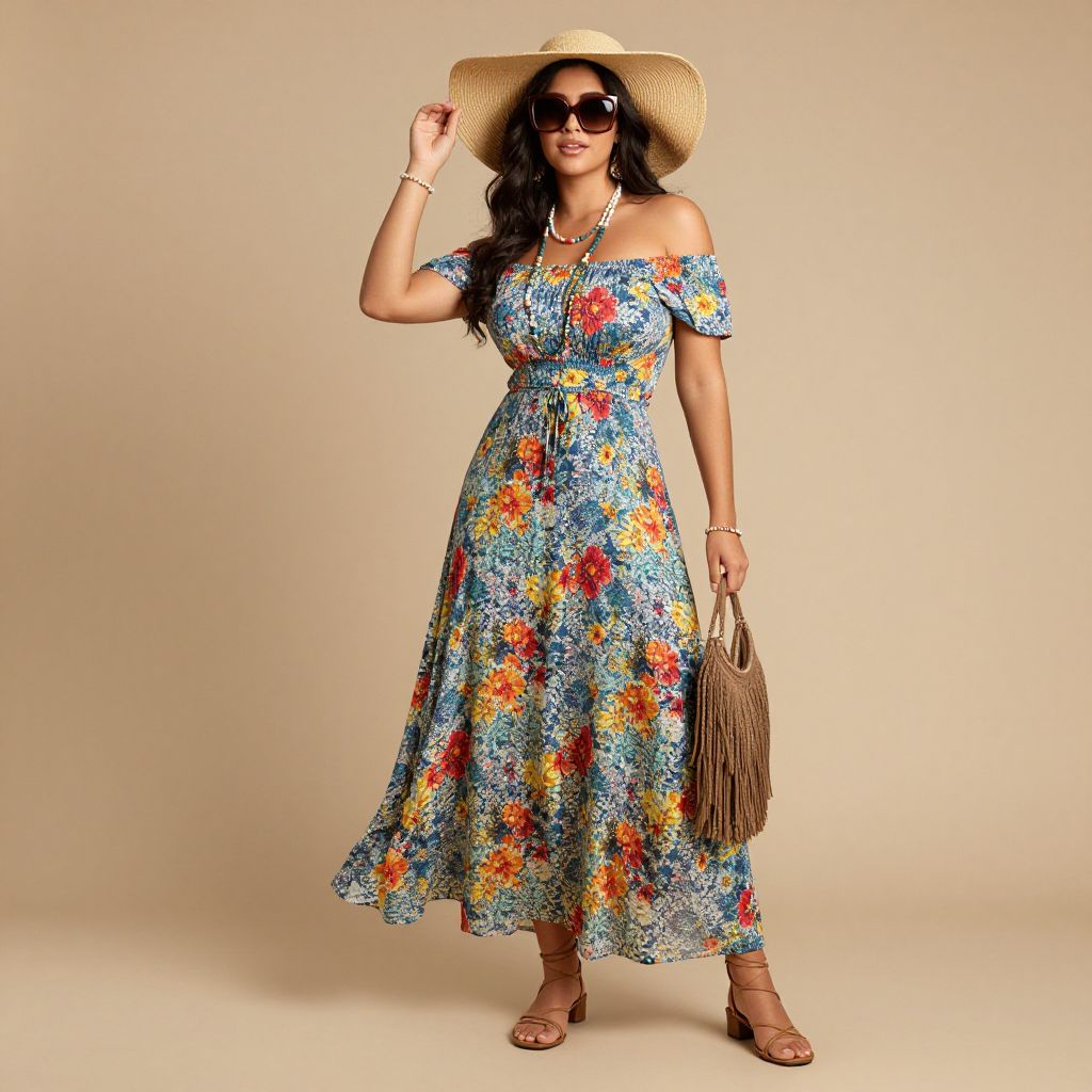 Full body shot, Busty woman, flowing maxi dress, vibrant floral patterns, lightweight cotton fabric, off-the-shoulder neckline, cinched waist, layered beaded necklaces, wide-brimmed straw hat, oversized sunglasses, strappy leather sandals, bohemian fringe handbag, delicate ankle bracelets, earthy color palette, relaxed fit, whimsical vibe Sexy. Pretty face and beаutiful eyes. Big breasts