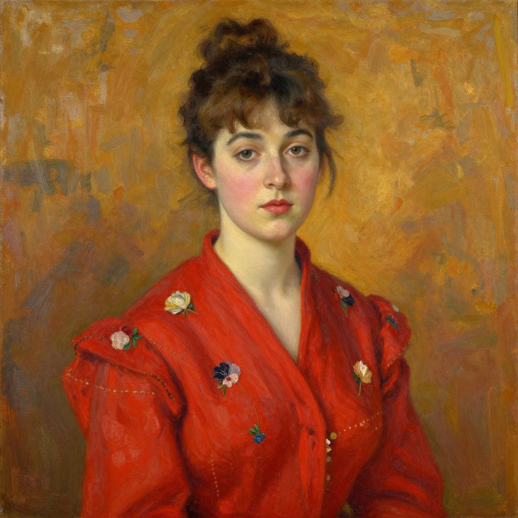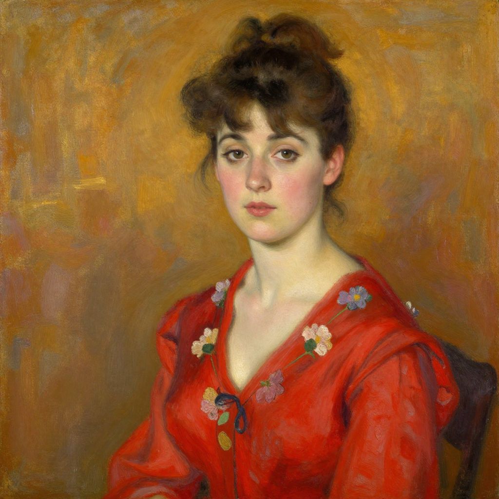 This is a digital painting in an impressionistic style depicting a young woman with fair skin and brown hair styled in an updo. She has dark, expressive eyes and light pink cheeks. She is wearing a vibrant red blouse adorned with small, colorful floral embroidery on the shoulders and chest. The background is a warm, textured blend of orange and brown hues, adding depth to the image. The woman's expression is calm and slightly serious, with a subtle, almost melancholic gaze directed at the viewer. The painting's texture is rich and slightly rough, characteristic of impressionistic brushstrokes.