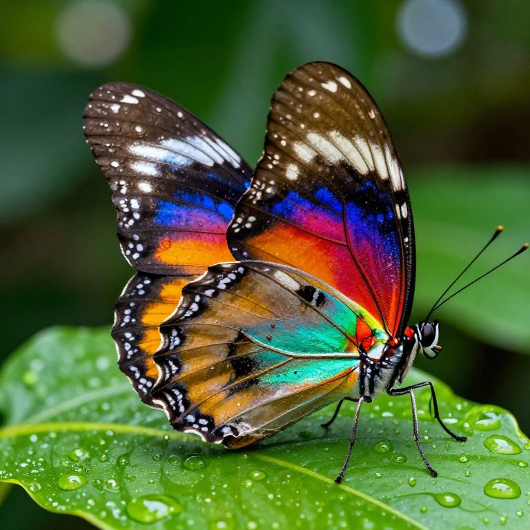 8000x8000 detailed macro shot of a vibrant tropical butterfly on a dewy leaf, hyper-realistic textures and iridescent wing patterns, lush natural background with soft bokeh effect, intense color saturation and sharp focus, photorealistic style