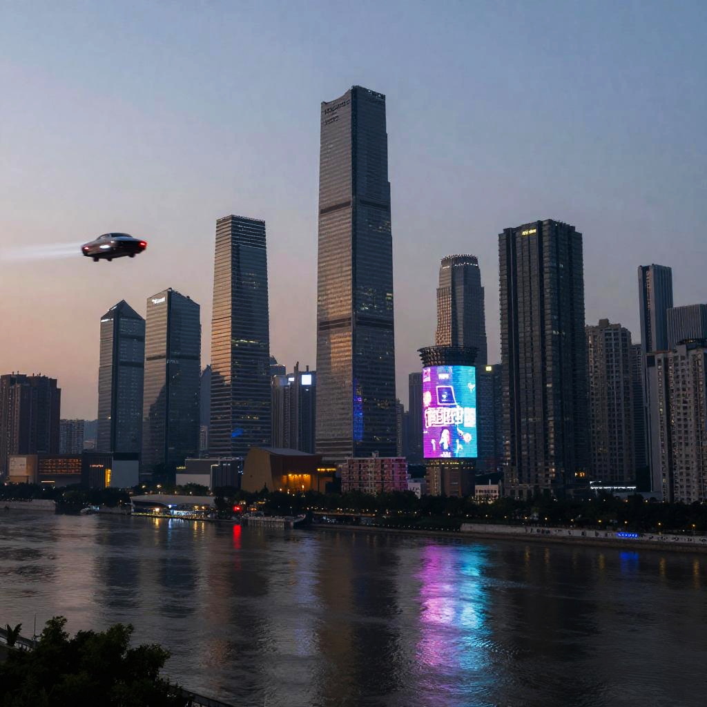 Folte futuristic city skyline at dusk, sleek skyscrapers with neon accents reflecting in calm river, flying vehicles and holographic billboards, cyberpunk aesthetic with moody lighting and atmospheric haze, vibrant metropolis with advanced technology